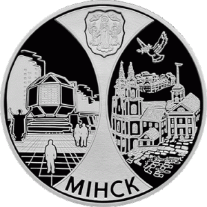 Оборотная сторона монеты поделена на два полукруга. В правой половине изображены здания исторической части города: Минской городской ратуши, Минского Свято–Духова Кафедрального собора, Троицкого предместья и символа мира – летящего голубя. Слева изображен коллаж из зданий жилого квартала г.Минска, Национальной библиотеки Беларуси, силуэтов памятника Ф.Скорины и людей. В верхней части монеты рельефное изображение герба г. Минска, внизу надпись: МІНСК.