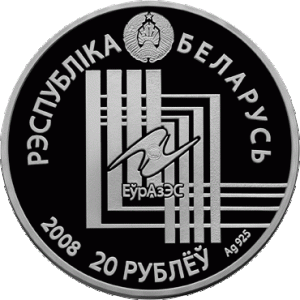 Вверху – рельефное изображение Государственного герба Республики Беларусь; в центре на фоне геометрической композиции изображен знак ЕврАзЭС и надпись ЕўрАзЭС; по кругу надписи: в верхней части – РЭСПУБЛІКА БЕЛАРУСЬ, в нижней – год чеканки, 20 РУБЛЁЎ (на серебряной) и 1 РУБЕЛЬ (на медно–никелевой), и проба сплава (на серебряной).