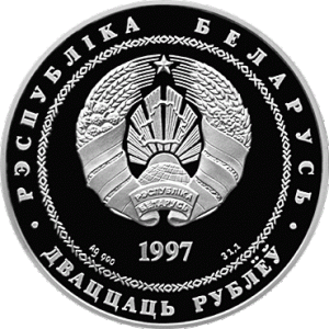 В круге, обрамленном геометрическим орнаментом, – рельефное изображение Государственного герба Республики Беларусь, под ним указаны год чеканки, для серебряной – масса драгметалла в чистоте и проба сплава; по кругу – надписи: в верхней части – "РЭСПУБЛIКА БЕЛАРУСЬ", в нижней – "ДВАЦЦАЦЬ РУБЛЁЎ" на серебряной и "АД3IН РУБЕЛЬ" – на медно–никелевой.