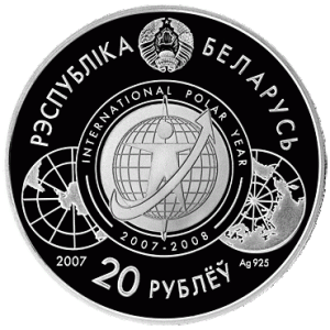 Вверху – рельефное изображение Государственного герба Республики Беларусь, по кругу надпись – РЭСПУБЛІКА БЕЛАРУСЬ, в центре – изображение эмблемы Международного полярного года; внизу – год чеканки, проба сплава и номинал – 20 РУБЛЁЎ.