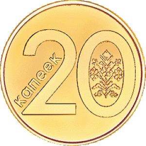 Реверс: в центре – цифровое обозначение номинала – 20, слева от цифры 1 вертикально расположена надпись – КАПЕЕК; в цифре 0 – стилизованное изображение национального орнамента.
